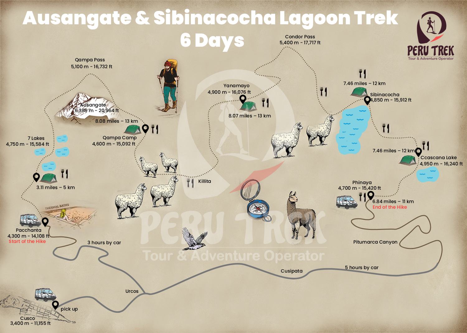 The trek includes plains and several mountain passes above 4,600 m (15,092 ft), reaching up to 5,400 m (17,717 ft) at the Condor Pass. It is essential to wear appropriate clothing and equipment for the cold, wind, and sudden changes in weather at high altitude.
